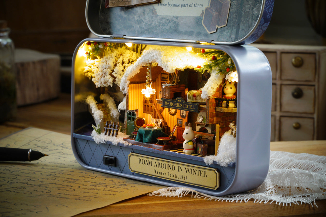 Roam Around in Winter” invites you to a nostalgic winter journey. Inside this tin box lies a warm hotel scene blanketed with snow, complete with a glowing fireplace, a stone bridge and a snowy tree.