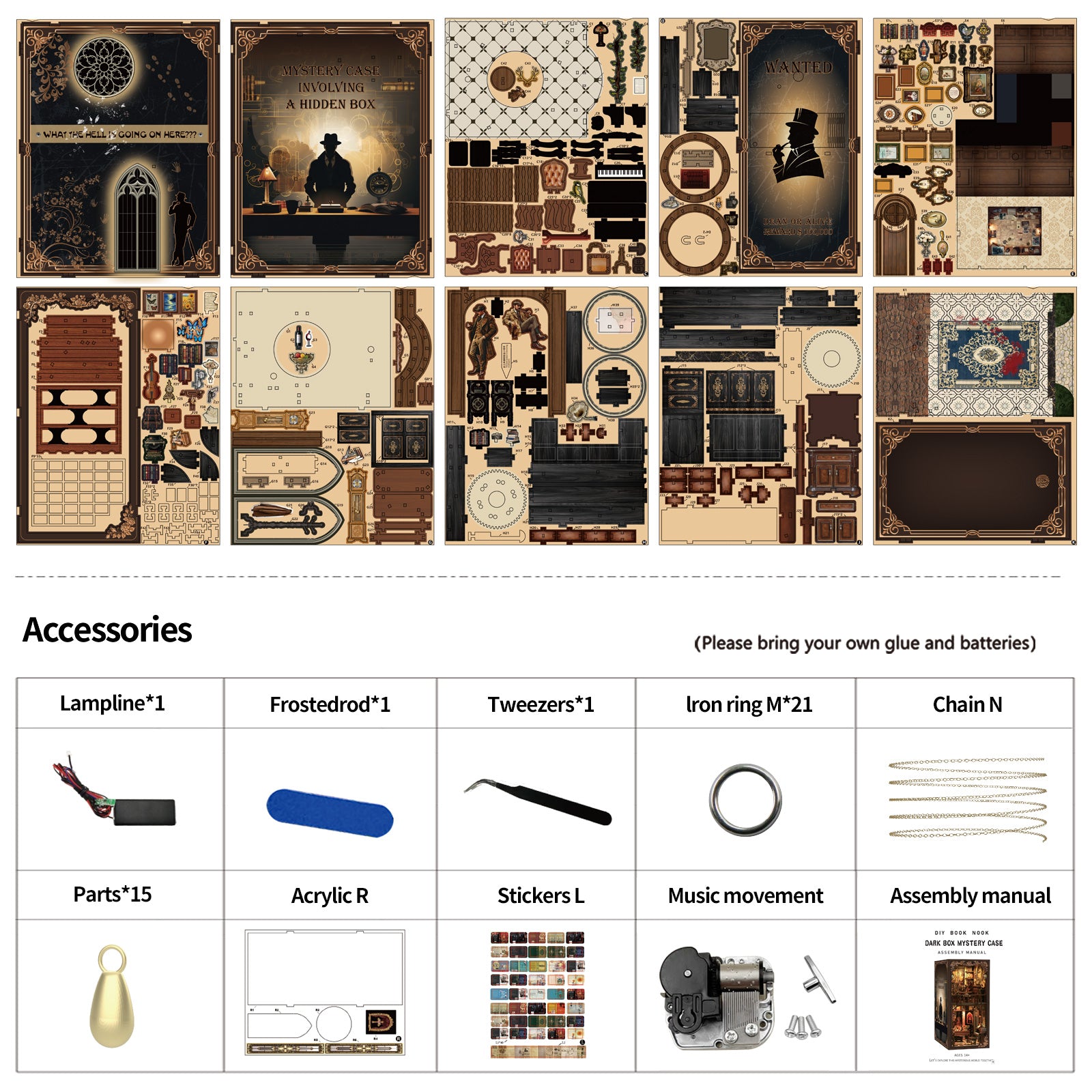 TJWFUNFUN DIY Book Nook Kit – Dark Box Mystery Case Enchanted Forest Library | Difficulty: ★★★★ | 270 Pieces | 6–8 Hours Assembly | 3D Wooden Puzzle Miniature Model with LED Lights & Music for Bookshelf Decoration
