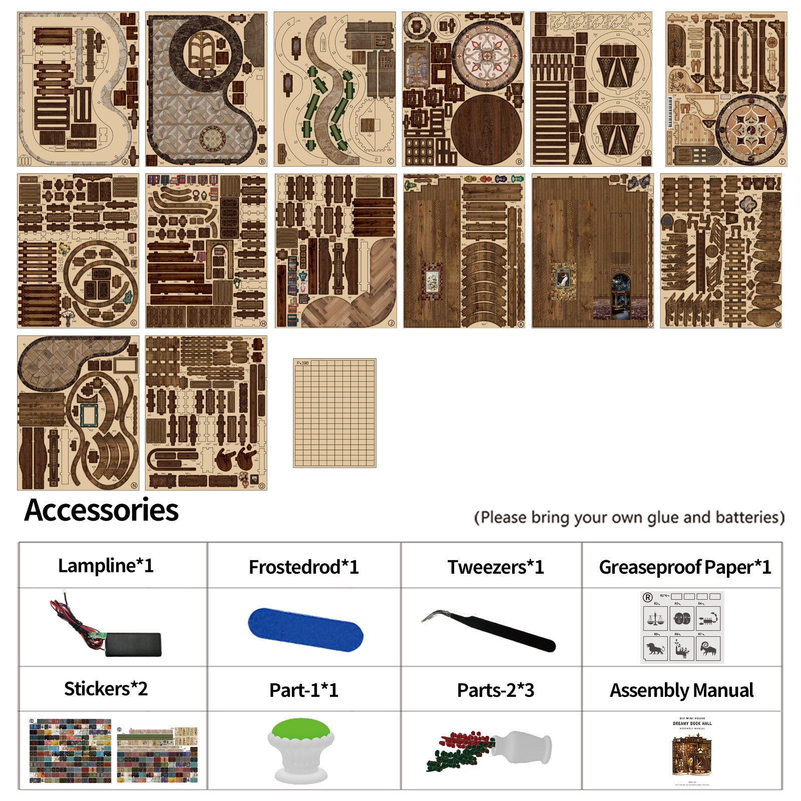 Included Accessories: Staircase, piano, bookshelf, lamp line, plants, stickers, tweezers, manual (glue and batteries not included)