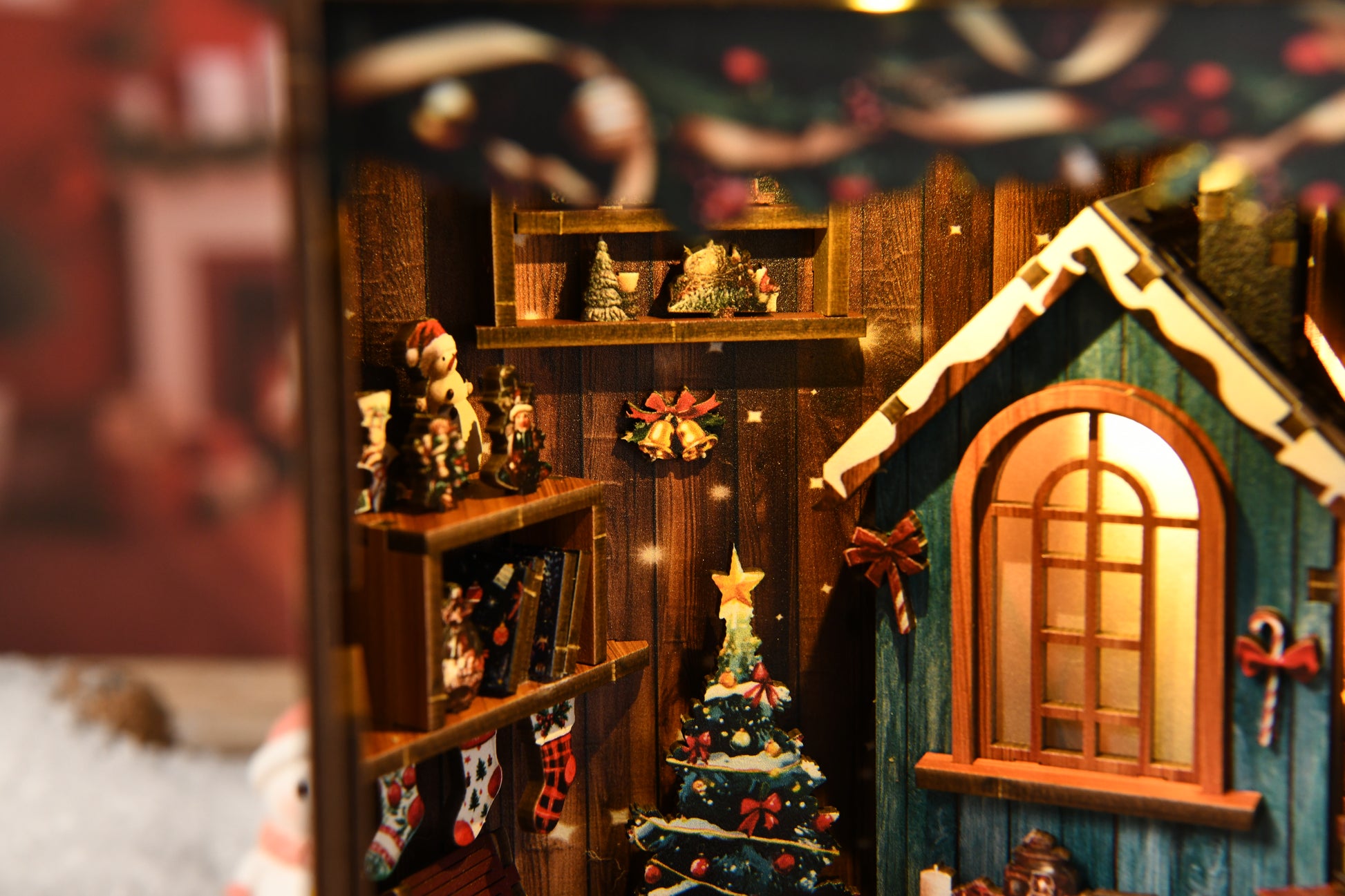 Step into a magical winter wonderland with the Snow Realm Wei Pavilion DIY Mini House Booknook. This enchanting kit features snowy rooftops, reindeer, lanterns, and festive holiday decorations, capturing the charm of a Christmas village in miniature form. With 161 precision-cut pieces, it offers a rewarding and creative build that brings seasonal cheer to your bookshelf or display. A delightful project for hobbyists and a perfect gift during the holidays.