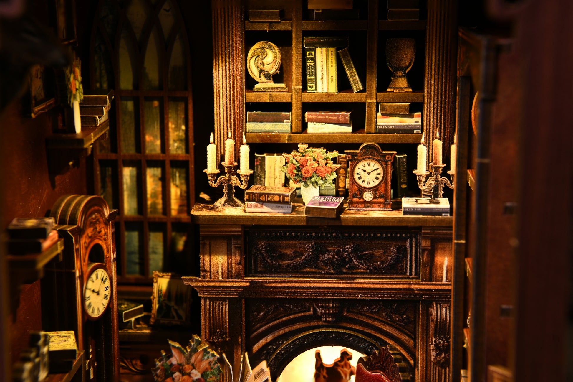 Immersive Retro Style – Realistic library theme with bookshelves, fireplace, and ornaments.