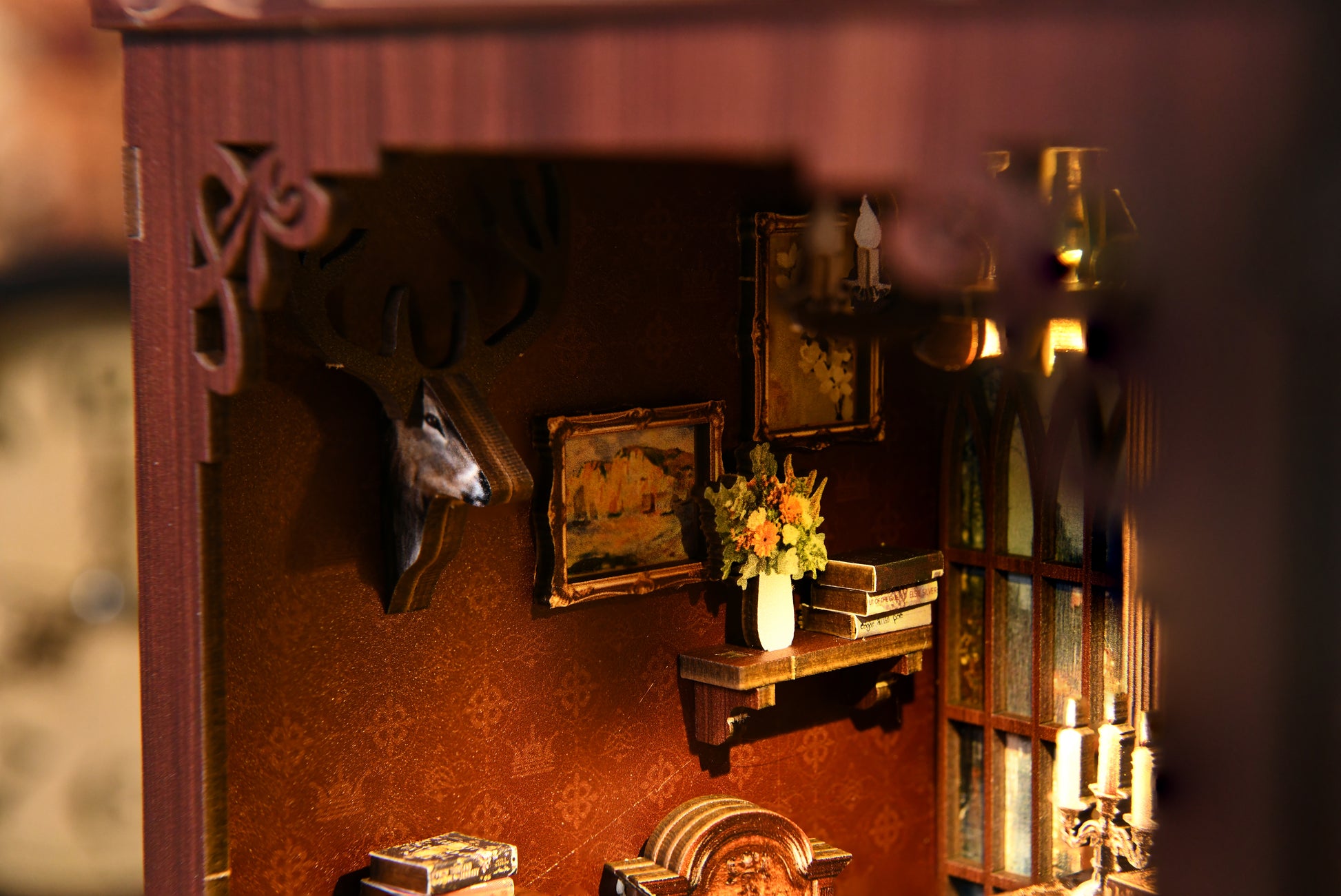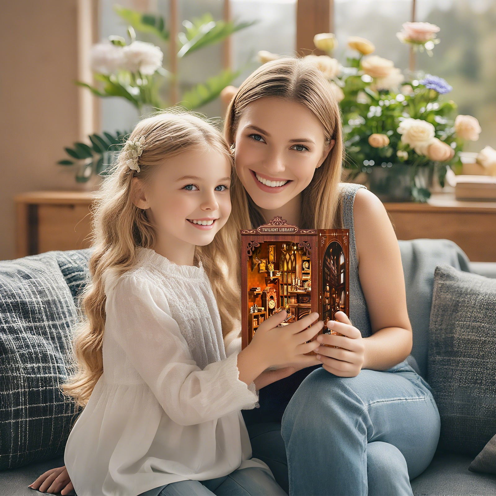 Bring the charm of a classic study into your home with the Twilight Library DIY Mini House Booknook. This enchanting kit recreates the warmth of an old-world library, complete with bookshelves, a glowing fireplace, a grand pendulum clock, and vintage décor details. With 194 precision-cut pieces and a built-in LED light system, it delivers a rewarding hands-on project and transforms into a captivating decorative piece for your bookshelf or desk.